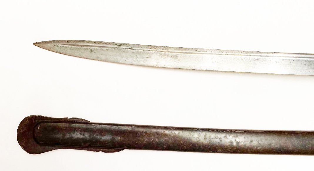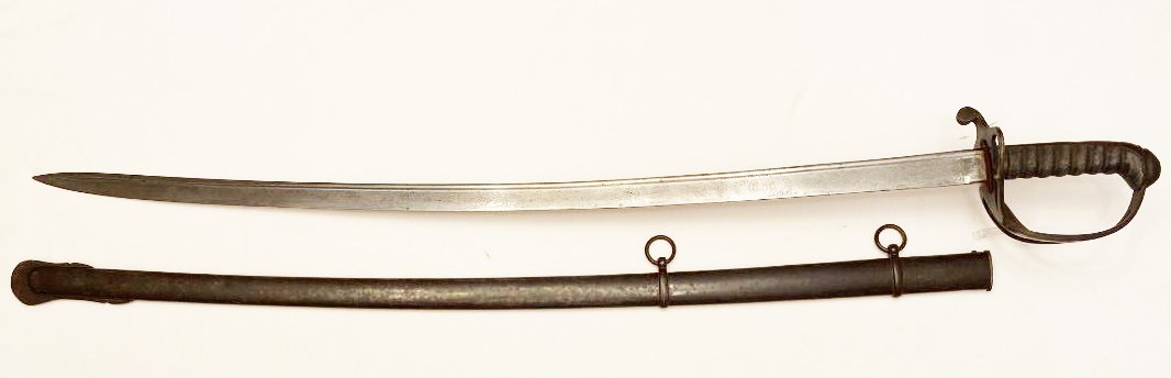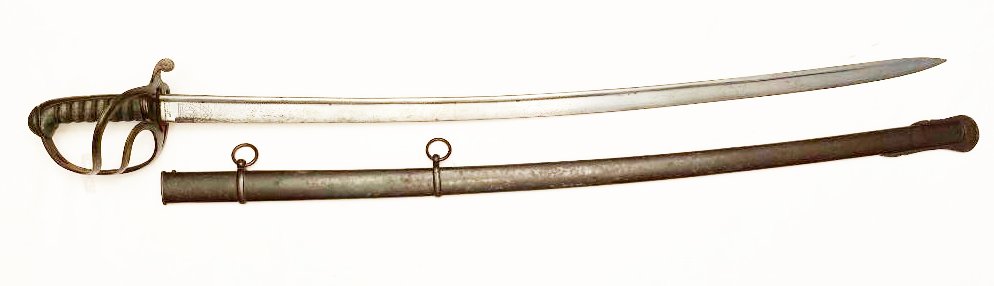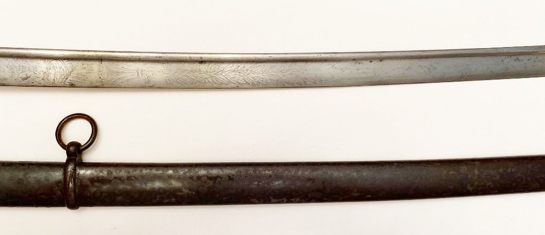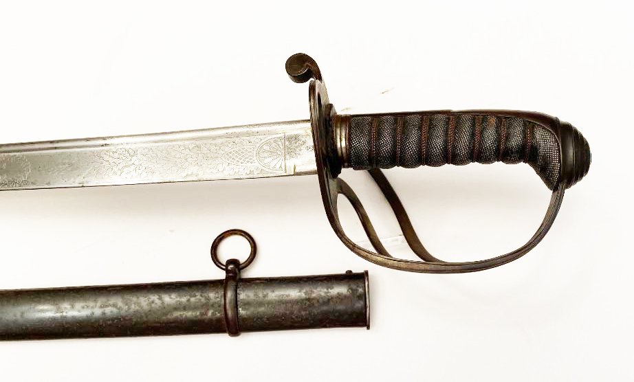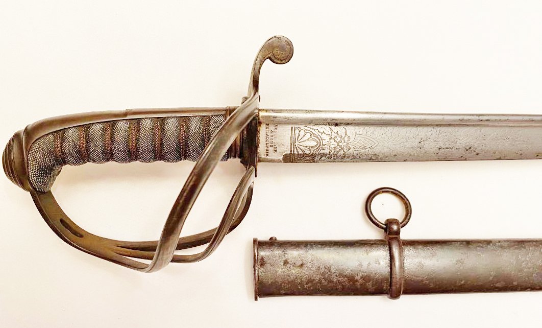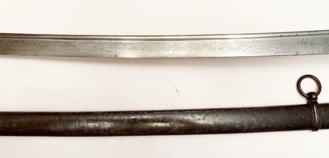 The First Troop of Philadelphia or City Troop as it was commonly called, is the oldest military organization in the United States, having formed on Nov. 17, 1774. Some of it?s original members served as George Washington?s personal bodyguards. The organization appears to be still active with membership by invitation. This saber dates from the Civil War or near the time. It was manufactured by Gebruder Weyersberg of Solingen , Germany and imported by Horstmann & Sons of Philadelphia. The reverse ricasso is stamped with the Kings Head mark of Weyersberg with the Horstmann stamp on the obverse. The blade is decorated with the usual floral designs with an American shield and eagle on the obverse and an eagle, Tecumseh , and CT (for City Troop) on the reverse. CONDITION: HILT the iron hilt has a black finish so possibly it was silver plated, the sharkskin grip and wire are tight and complete. BLADE a bright steel color, marks are clear. SCABBARD blued scabbard has some light rust spots beginning, still a dark color, no dents. Please see pictures. Shipping $40