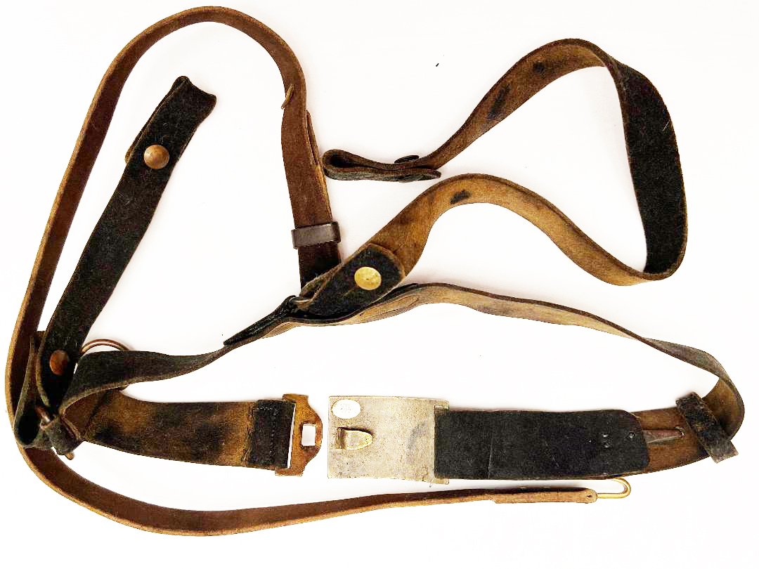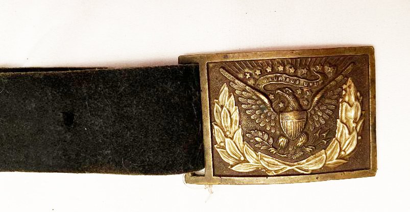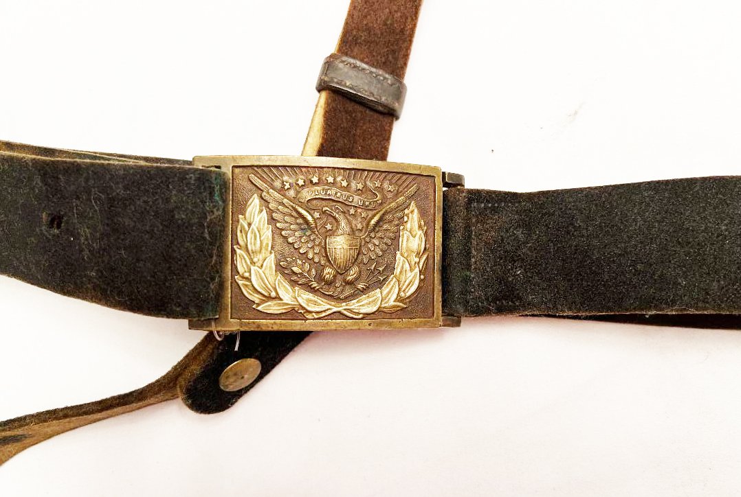 This buff leather belt was used by the cavalry prior and during the Civil War. Would make a great display with a saber. Condition; This is an authentic piece. The leather is very supple and shows little wear for it?s age. The shoulder strap appears to be a replacement but it is of the period. The early M1851 belt buckle has a ? inch casting flaw otherwise in nice condition. Flaw not noticeable from the front. Please see pictures. Shipping $30.00